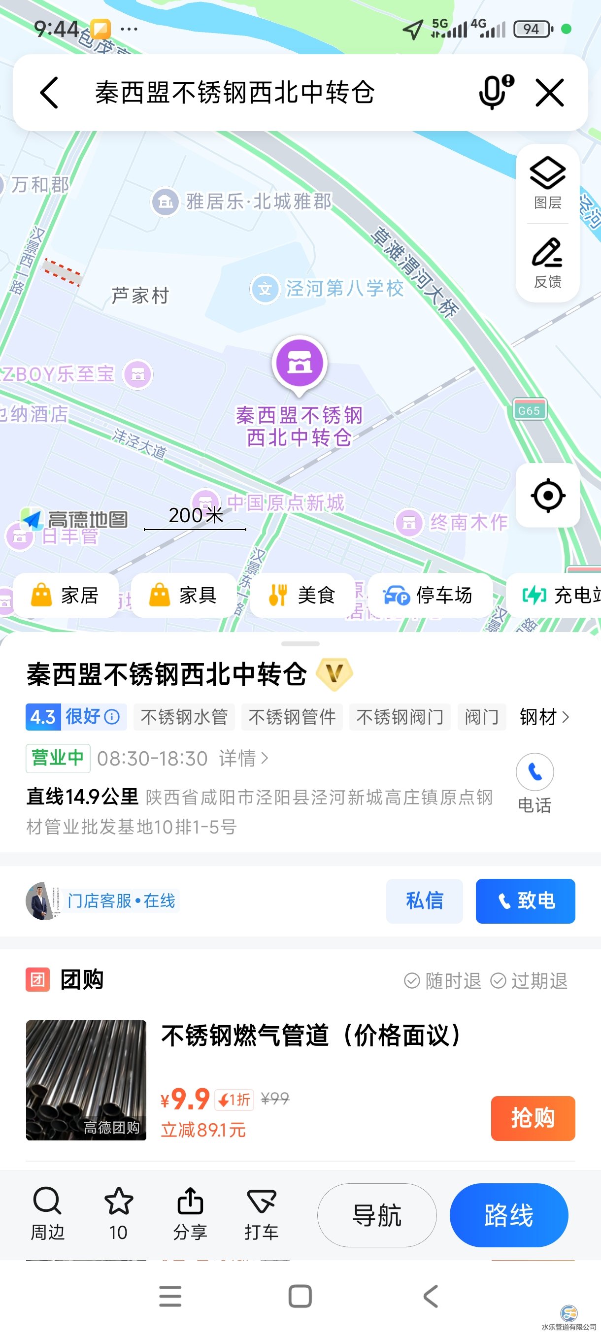 秦西盟水乐高德店铺的另一大亮点是“服务透明化”。客户可实时查看附近仓库的管材规格、库存数量及价格,并通过平安保险承保的电子合同系统完成在线下单。此外,店铺页面还集成了秦西盟水乐的荣誉资质展示,包括高新技术企业认证、AAA信用评级等,增强客户信任度。