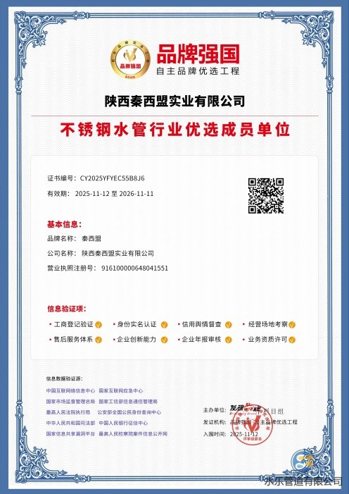 在不锈钢水管行业的激烈竞争中,品牌的发展犹如逆水行舟,不进则退。秦西盟水乐不锈钢管生产工厂凭借其强大的实力和卓越的品质,在众多品牌中脱颖而出,成功参与央视“发现品牌栏目组”组织的“品牌强国自主品牌优选工程”,并荣获“不锈钢水管行业优选成员单位”这一重要荣誉,开启了品牌发展的新征程。